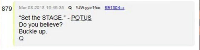 I’ve been following Q anon videos on Youtube and I now can verify that the POTUS is working with an individual that has high security clearance access to intelligence known as Q. The post on an 8chan board, with many posts from Q that started about 4 months ago interacting with various anons, yesterday at 4:45 EST preceded a speech with Trump about the North Korea matter regarding a meeting with Kim Jong Un. In the Q post, the first line contained the following words: