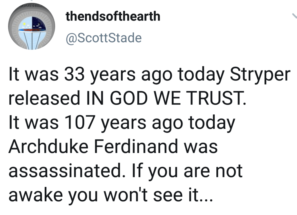 I try to include in every monthly review something that catches my attention that I will call an Inexplicable Parallel Pattern. So Stryper’s In God We Trust album was released on June 28, 1988. Archduke Ferdinand was assassinated on June 28, 1914. In the 2 images below there are 2 yellow and black “bullseyes”. They can also be illustrations of interdimensional portals. The Stryper image was from the Live at Budakon video in Japan from the In God We Trust tour and the other image is from the band Franz Ferdinand of their Take Me Out video. This is definitely an Inexplicable Parallel Pattern…