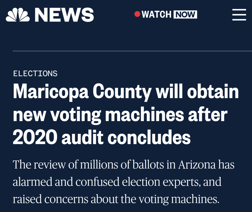 There are 2 takeaways just from looking at the headline to this news item. First, the fact that the MSM is now reporting on the audit means they can no longer play gatekeeper to what many believe has been systemic election fraud. Also, the fact that Maricopa County is obtaining new voting machines means they found serious irregularities from the count shortly after election day and the audit that is now complete. We are simply going to have to wait until they compile all the data and we are given a detailed account of what they found…