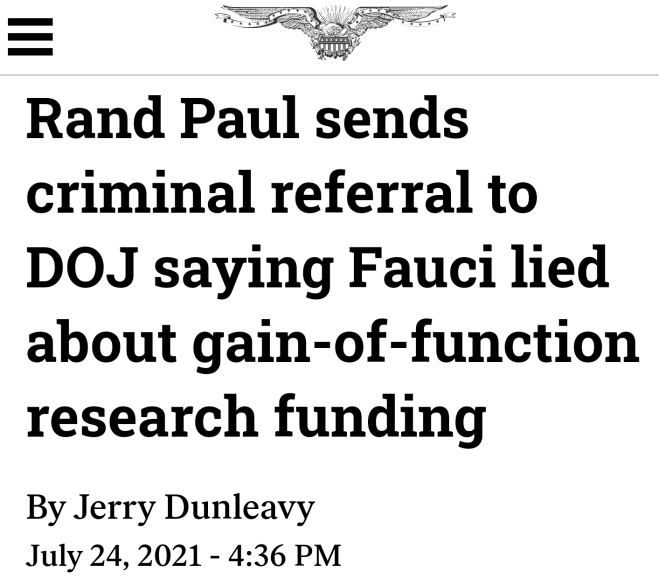 Rand Paul was grilling Dr. Fauci regarding the gain of function research at the Wuhan Lab in China. Fauci vehemently denied Rand Paul’s accusations claiming Dr. Paul didn’t know what he was talking about. This is a problem when scientists say too much through the media, however, it was displayed in FOIA emails from Dr. Fauci’s email account that we were not getting forthright information from the nation’s highest paid public employee. For those paying attention would note how much the goal posts keep changing. We went from being told this virus was started in a wet food market to seeing in one of Fauci’s email’s that a small portion of this virus looks engineered. I do think this is just theater, however, because I don’t see the current AG doing anything with it…