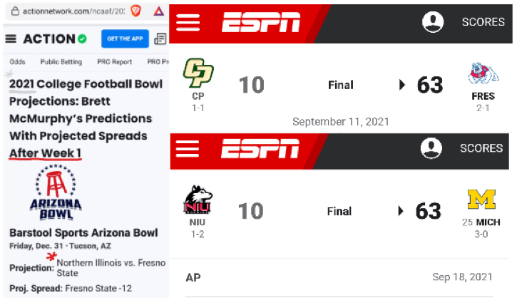 This month’s Inexplicable Parallel Pattern shows 2 games final scores identical involving 2 teams that were projected to square off after week 1 in the Arizona Bowl–Consider the Arizona Audit. After week 1 Brett Murphy projected NIU vs Fresno State in the Barstool Sports Arizona Bowl in Tucson. In week 2, Fresno State beat Cal Poly 63-10. In week 3, Michigan beat NIU 63-10. The following Friday the Arizona Audit Report dropped. These are not coincidences; This is an Inexplicable Parallel Pattern that demonstrates that we are likely living in a video game…