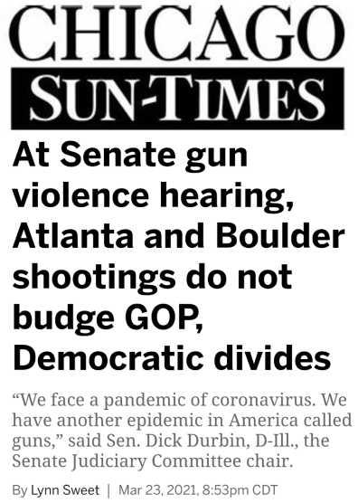 This is reminiscent of what happened in early August 2019. There were 2 mass shootings that occurred in 2 different places (El Paso & Dayton) within 24 hours of each other overshadowing multiple shootings in Chicago over the same weekend. This time, 2 mass shootings in 2 different places within a week of each other overshadowing multiple shootings in Chicago over the same time period. The hearing announced by Senator Durbin hours before the Atlanta shooting is too coincidental for me to believe it was just coincidental…